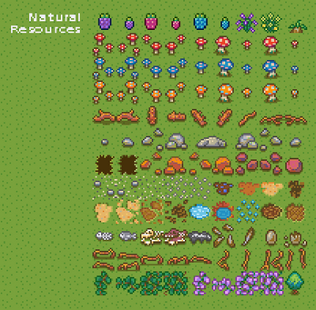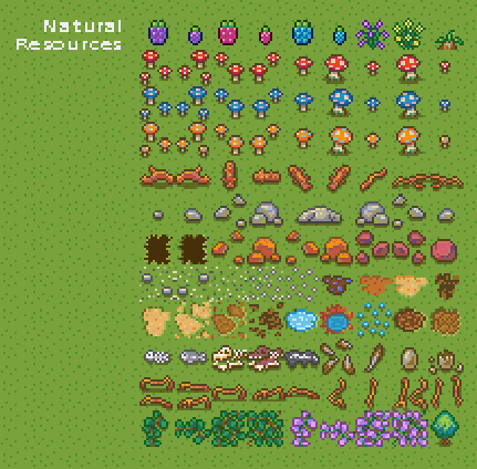 Environment Tiles: Grass, dirt, stone, water, and cave floors.