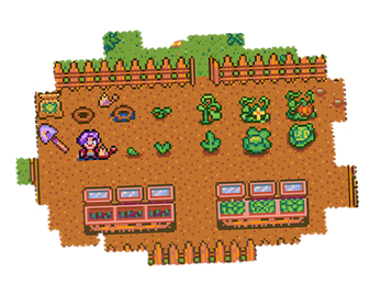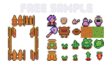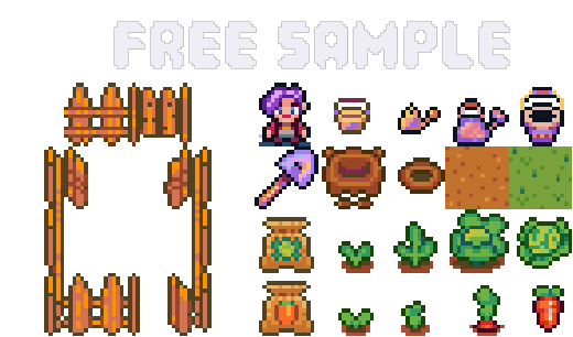 Including: 1 sprite, a tileset of 9 fence tiles and 2 tiles of soil and grass , 9 props and icons (bucket, watering can, shovel, digging holes, sucks of seeds), 2 crops (4 cabbage growing stages assets and 4 carrot)
