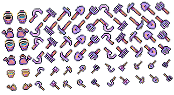- Tools & Items – watering cans, rakes, sickles, seed bags, shovels, pitchforks, buckets, and more