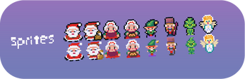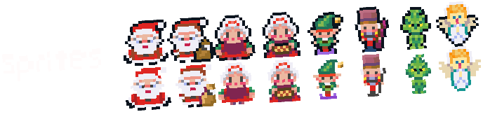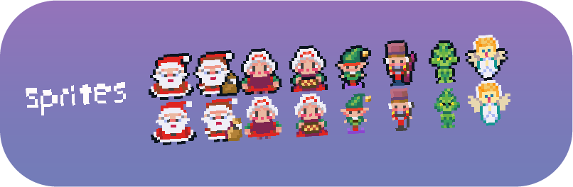 - Sprites – Santa Claus (4), Mrs Claus (4), Elf (2), Nutcracker Soldier (2), Grinch (2), Singing Angel (2) – total (16)