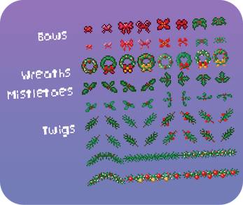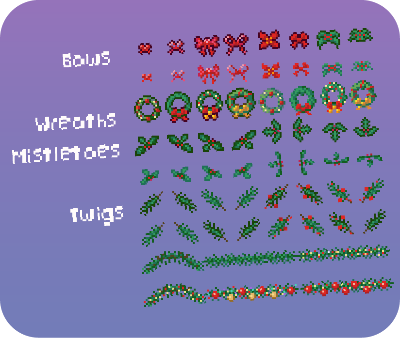 - Twigs (32 – including 6 tilesets of swags and garlands with a total of 16 tiles)