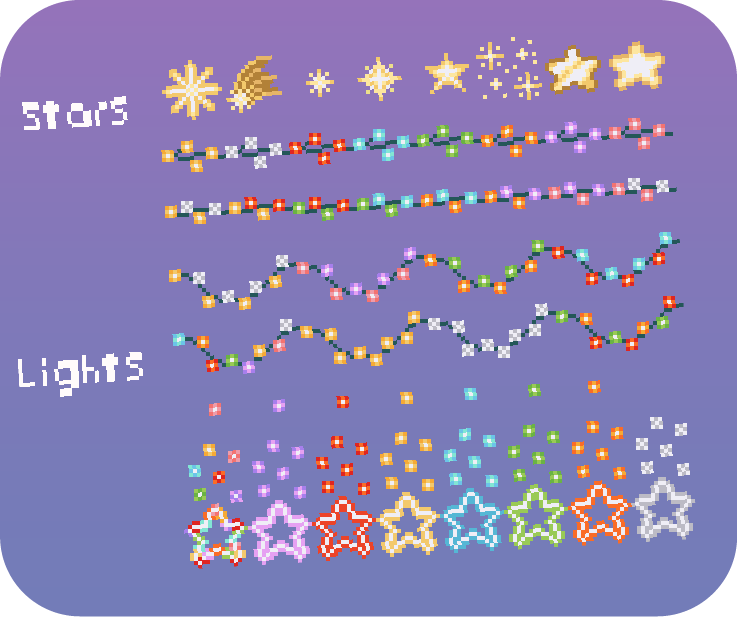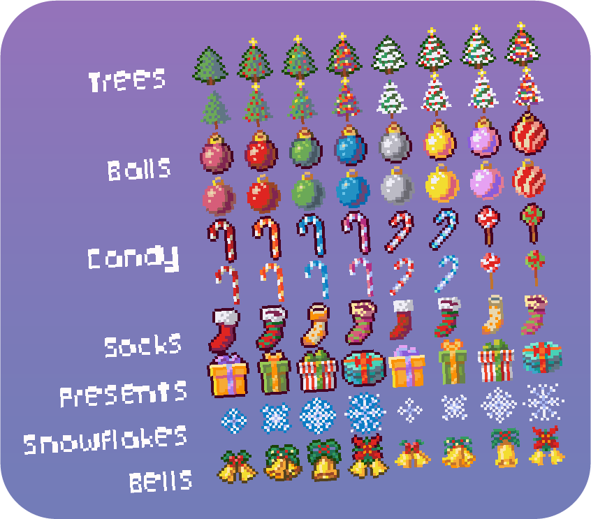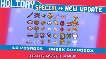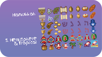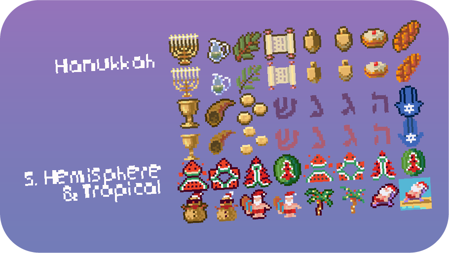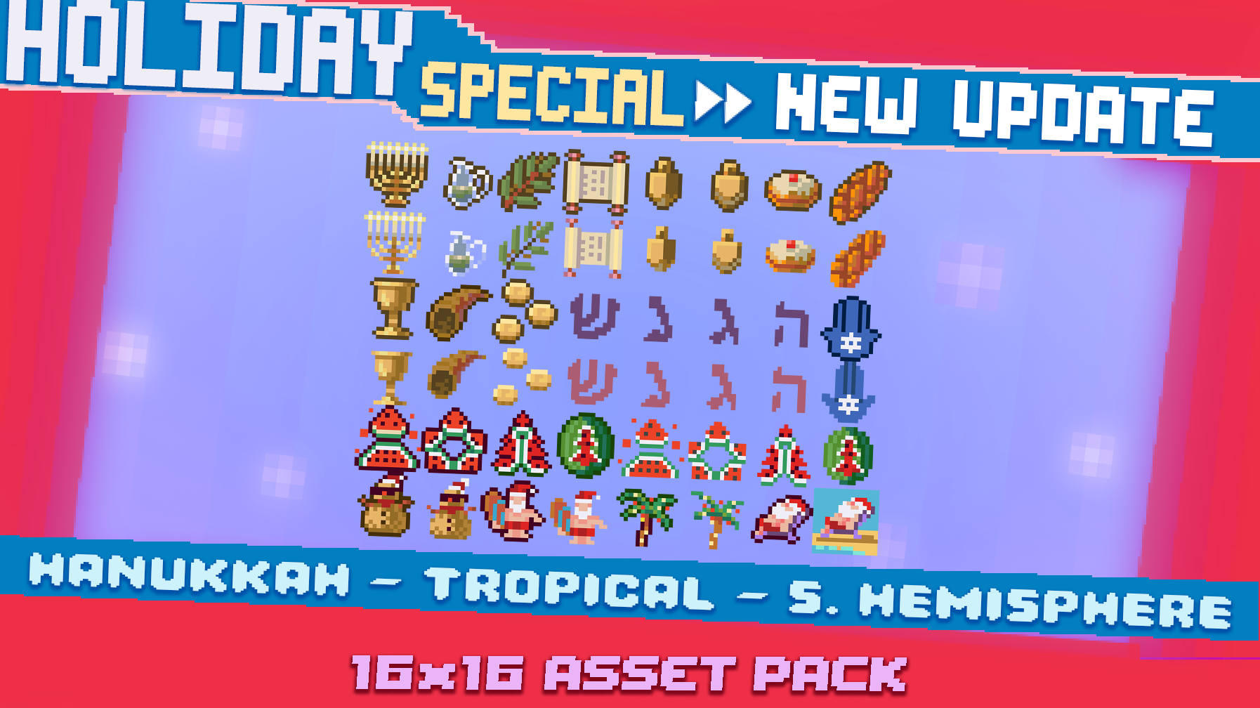 | Tags | 16x16, Christmas, hanukkah, holiday-pack, Icons, kwanzaa, new-years-day, Pixel Art, Roguelike |